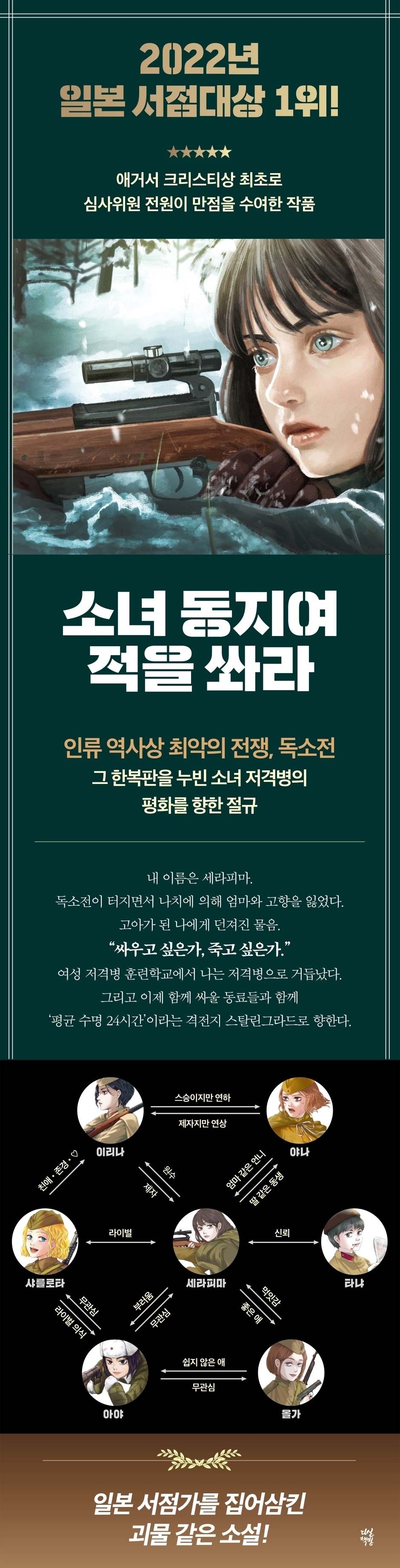 533p 세라피마가 전쟁에서 배운 것은 800미터 너머의 적을 쏘는 기술도, 전장에서 갖게 되는 인간의 처절한 심리도, 고문을 견디는 법도, 적과의 힘겨루기도 아니다. 생명의 의미였다.