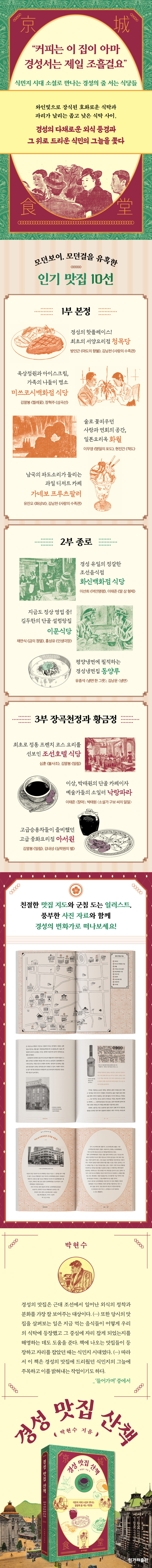 경성과 맛집이라는 이질적인 단어와 낯선 주제에 대한 내용을 담은 책<경성 맛집 산책>은 박현수 작가의 신작이다. 경성의 맛집을 ‘산책’하며 그때의 풍경을 드러내고 있다. 그 당시에 일제강점기의 치하에 있었던 식민지가 배경이었기 때문에 현시대에서는 상대적으로 알려지지 않은 것을 담아냈다. 서양 음식점부터 시작하여 그때 당시, 경성의 번화가에 열린 가게들을 중심으로 생생하게 느껴진다. 그와 동시에 경성 곳곳에 자리 잡은 맛집과 식민지의 그늘 대비는 그 맛들이 더욱 씁쓸하게 맴돈다.