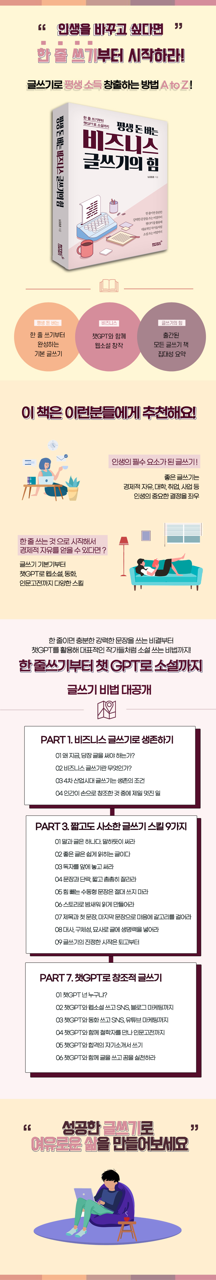 인공지능이 주체가 되는 4차 산업 혁명에서 우리에게 큰 무기가 될 ‘글쓰기’를 어떻게 ‘잘’ 쓰면 될까. 여러 가지 논점에서 상당한 논란을 일으키고 있는 챗 GPT를 이용하여 비즈니스 글쓰기 기술을 소개한다. 글은 생각을 담는 그릇이고 챗 GPT는 사유할 지식으로 이용하여 이전과는 다른 방식으로 효과적인 글쓰기를 시도한다. 글 쓰는 목적이 순수하지 않다고 하더라도 적어도 하고자 하는 말을 돌려 말하지 않고 직설적으로 표현하는 방식이 인상적이었다. 목적부터가 ‘비즈니스 글쓰기’에 초점이 맞춰져 있으므로 <평생 돈 버는 비즈니스 글쓰기의 힘>은 글쓰기가 두려운 사람들에게 더 필요한 책이 될 것이다.