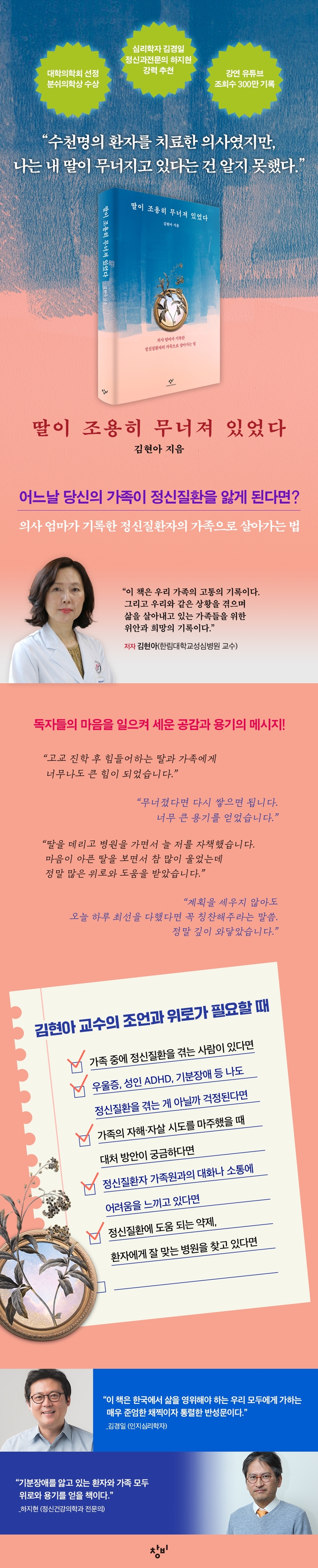 <딸이 조용히 무너졌다>는 김현아 작가가 실제 정신질환을 앓는 딸을 가족으로서 보살피고 살아낸 여정의 기록을 담아낸 책이다. 고통스럽고도 사적인 경험을 공유한다는 건 다시 편견에 마주하게 될 수도 있는 일일 수도 있지만 그럼에도 공개적으로 나누기 위한 것은 의사인 자신조차 가족의 정신 질환에 대처하는 일이 쉽지 않았는데, 정신질환자와 함께 살아가는 가족들은 얼마나 막막할지를 생각했기 때문이었다. 그래서 정신 질환과 관련된 지식과 경험을 7년 동안 쌓아왔고 그에 따른 정신 질환자와 함께 살아가는 데 필요한 여러 가지 정보를 공유한다. 비슷한 경험을 가지고 있는 가족들뿐만 아니라 정신 질환에 대한 이해를 넓히고 싶은 이들에게도 추천하고 싶은 책이다.