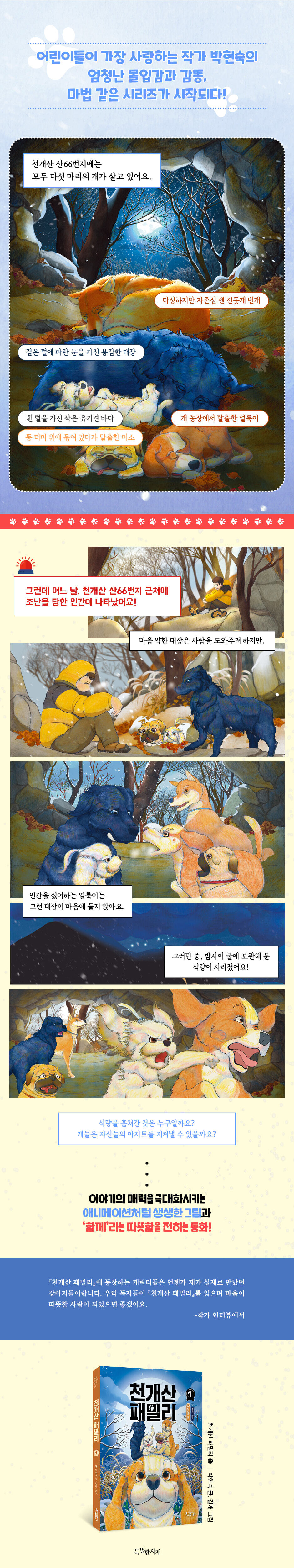 박현숙 작가의 신작 소설 <천개산 패밀리>는 총 두 권으로 구성되어 있다. 이 책은 버려진 개들이 모여 하나의 가족이 되어가는 이야기를 담고 있다. 글과 그림을 적절히 섞어내어 재미있고 실감 나는 이야기로 다가온다. 귀여운 그림체와 따뜻한 이야기 전개가 특징이다. 동화라서 유치하다고 생각하거나, 소설이라 지루하다고 생각했던 사람들도 충분히 재미있게 읽을 수 있는 책이다.