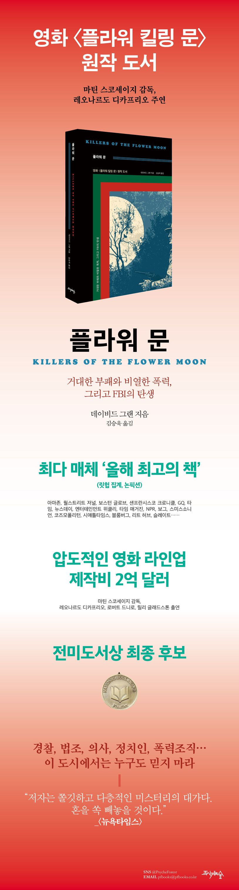 소설이라고 했지만, 논픽션 형태로 이야기가 전개된다. 실화를 바탕으로 한 만큼 사실적인 묘사가 돋보였고 상당히 이야기의 전개를 흥미롭게 진행한다. 조사를 많이 한 것 같고 그 부분을 잘 나열하면서 복잡하게 얽혀있는 부분을 잘 풀어간 것 같다. 책이 꽤나 두꺼워서 부담스러울 수 있지만 재미있어서 단숨에 읽을 수 있어서 좋았다. 물론 영화를 보기 전에 내용을 다 알고 가면 재미가 반감될 수 있지만 영화와 소설의 재미는 또 제각기 다른 매력을 주기 때문에 소설을 먼저 보게 되었다. 그리고 워낙 소설이 재미있기 때문에 영화와 비교하며 보면 더욱 재미있을 것 같았다. 소설을 다 본 지금, 영화는 어떻게 표현했을지 궁금해졌다. 제76회 칸 영화제 비경쟁 부문에 초대되어 9분 간의 기립 박수를 받았다고 전해졌다. 그의 페르소나인 레오나르도 디카프리오와 로버트 드 니로가 나온다는 소식에 더욱 기대가 됐다.