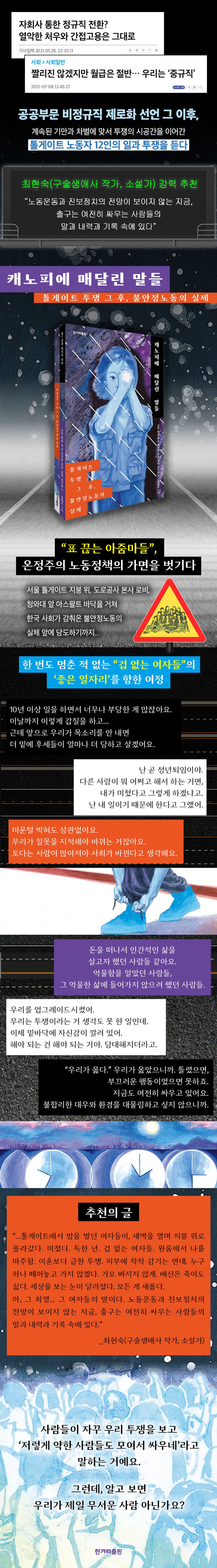 기사로만 접했던 사건을 당사자들의 구술 방식을 통해 볼 수 있었던 책이었다. 법원의 판결 후 후속기사가 전해지지 않아서 어떻게 되었는지 알 수 없었는데, 책을 통해서 여전히 지속되고 있는 투쟁을 마주하고 있는 노동자들의 이야기를 들을 수 있었다. 그들이 미처 전하지 못한 말들이 어떤 것이었는지를 명확하게 알게 되었다. 이 투쟁을 계기로 순응하고 받아들이던 기존과는 다르게 끝없는 문제를 제기해야 한다는 사실을 깨닫게 되었다. 이렇게 해피엔딩은 아니었지만, 그들의 내면에 많은 변화가 있었다는 건 확실했다.