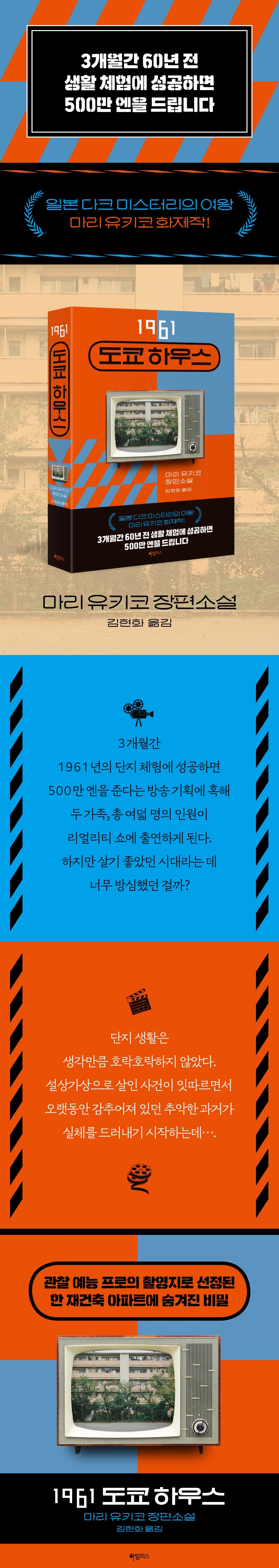 일본의 대표적인 이야미스 작가인 마리 유키코의 새로운 소설이 출간되었다. 이야미스는 ‘싫다’라는 뜻의 ‘イヤ’와 ‘미스터리’의 일본식 표기 ‘ミステリー’의 합성어로 보고 나면 싫은 기분이 드는 미스터리를 통칭하는 표현이다. 일본의 독자적인 미스터리 서브 장르 중 하나이며 다크 미스터리라고도 칭한다. 마리 유키코는 이야미스의 3대 여왕으로 꼽히며 이번 신작에서도 그 모습이 잘 드러난다. 장편소설 <1961 도쿄하우스>는 관찰 예능과 살인 사건이라는 두 가지 소재를 결합하여 긴장감 넘치는 스토리를 만들어 내었다.