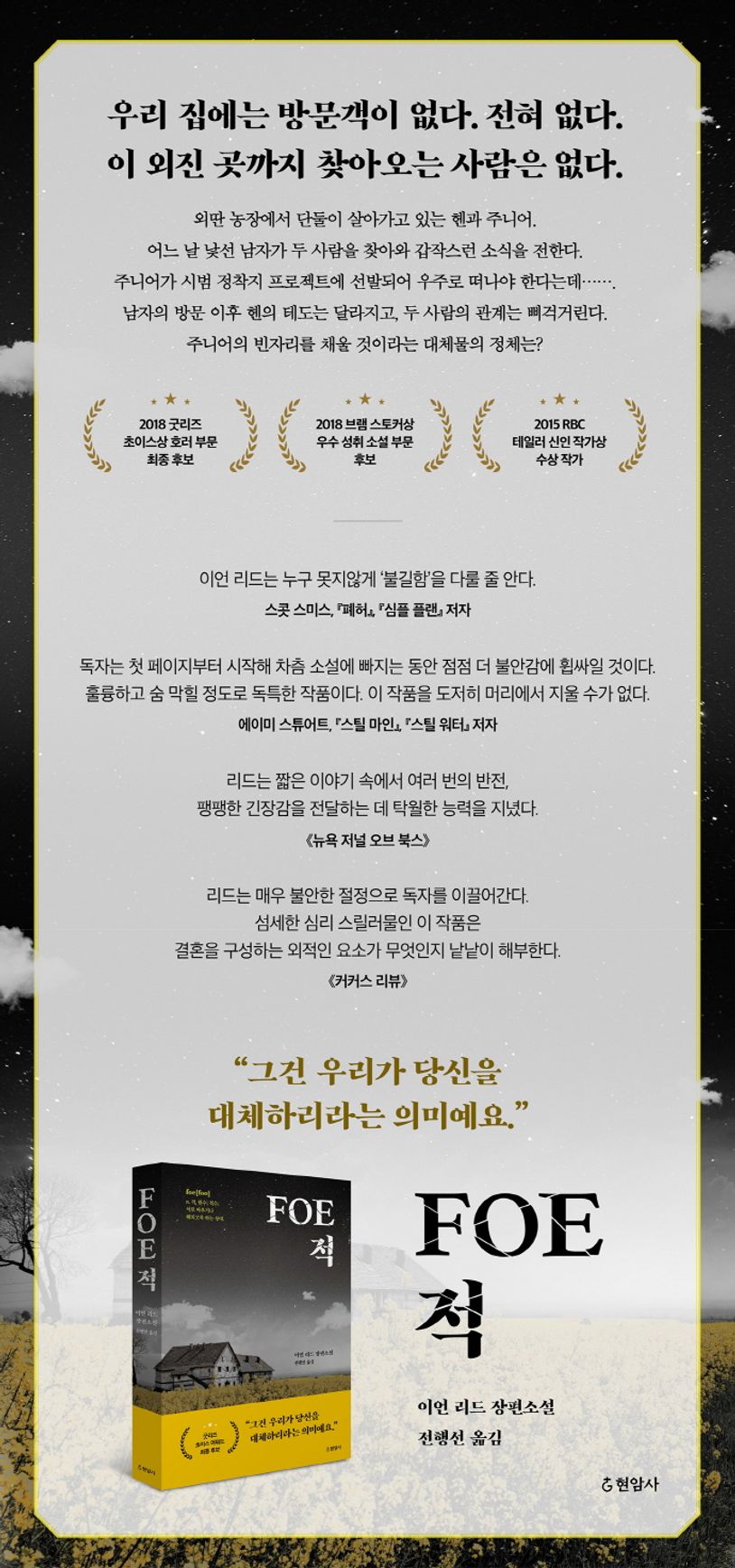 이언 리드 장편 소설 <적 FOE>는 SF 심리 스릴러 소설로 먼 미래의 시골 농장을 배경으로, 한 부부의 불안정한 관계를 통해 인간의 본성과 관계의 본질에 대한 질문을 던지는 작품이다. 가스 데이비스 감독의 신작 영화로 영화화 되었다는 소식에 원작 소설을 먼저 감상하기로 했다. 소설을 보고 나서 시얼샤 로넌과 폴 메스칼이 표현할 <적 FOE>의 모습이 더욱 궁금해졌다. 거듭된 의심과 그에 따른 관계 변화는 FOE 적에 정체를 더욱 궁금하게 만든다.