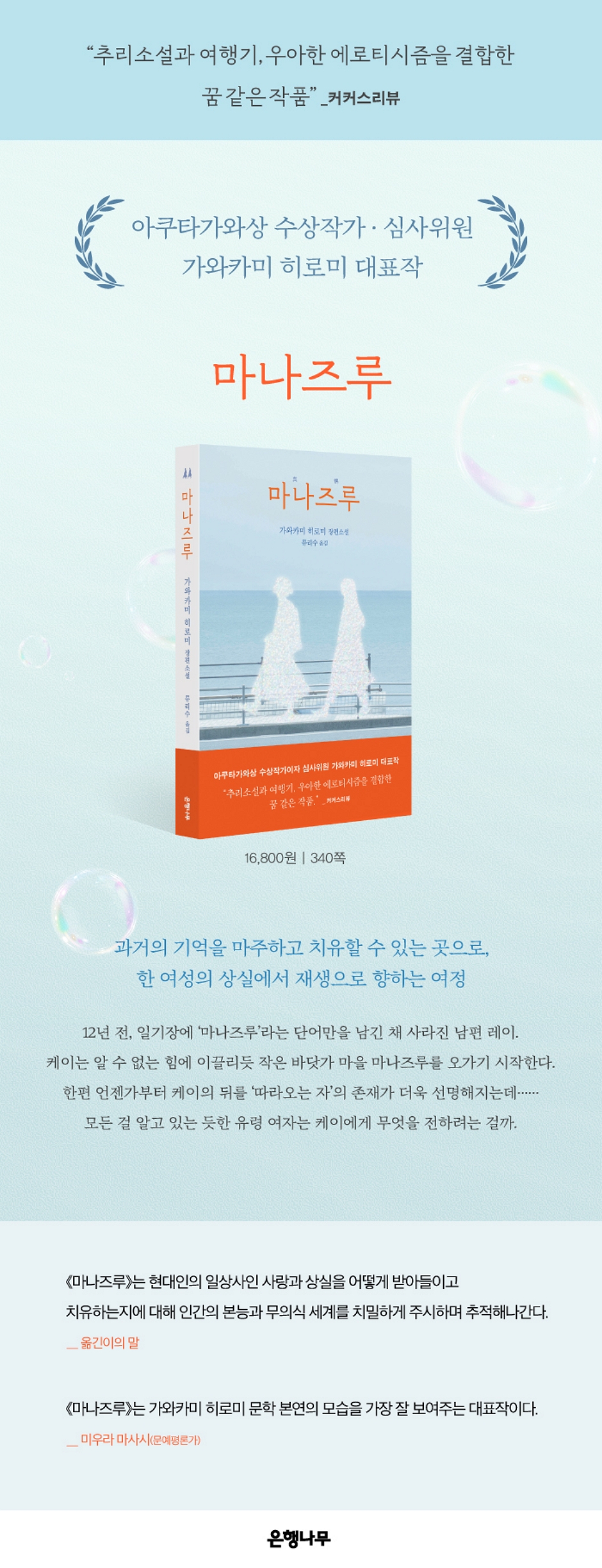 가와카미 히로미의 장편 소설 <마나즈루>는 사랑하는 사람의 부재로 인해 오랜 아픔을 외면했던 한 여성이 작은 바닷가 마을인 마나즈루를 오가며 상실을 회복해 가는 과정을 그렸다. 낯선 존재의 기척과 남편의 흔적이 묻어나는 마나즈루, 그곳에 과연 어떤 비밀이 숨겨져 있을까. 마음과 함께 흘러가는 모호한 이야기의 전개가 매력적인 책 <마나즈루>는 2006년 발표작임에도 불구하고 빛바래지 않은 신선함이 돋보인다.