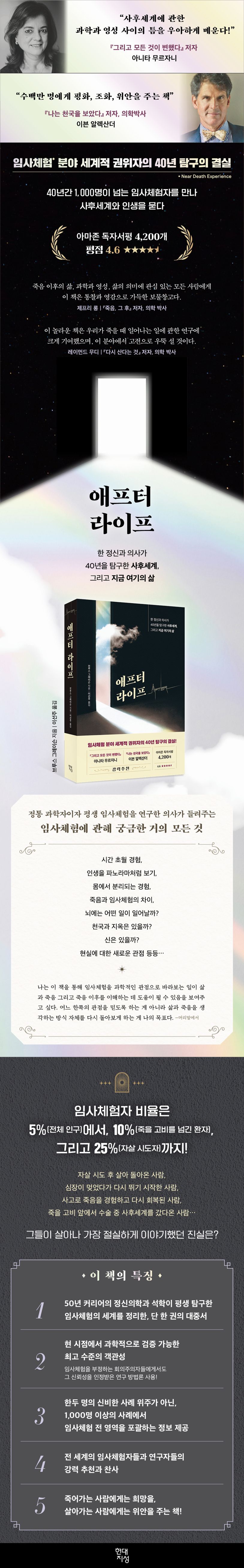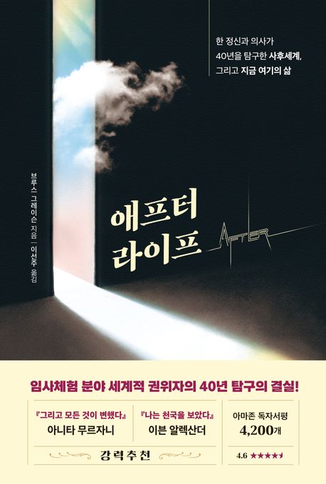 브루스 그레이슨의 <애프터 라이프>는 임사체험에 대한 심층적 연구를 담았다. 저자는 정신과 의사로서 40년간 1,000건 이상의 임상 체험 사례를 수집하고 분석하였다. 또한, 임사체험 연구결과를 바탕으로 임사체험의 과학적 탐구를 서술한 책이다. 이 책은 임사체험에 대해 궁금증을 가지고 있는 사람들뿐만 아니라 삶과 죽음에 대한 근원적인 질문을 던지는 사람들에게도 유익한 책이 될 것이다.