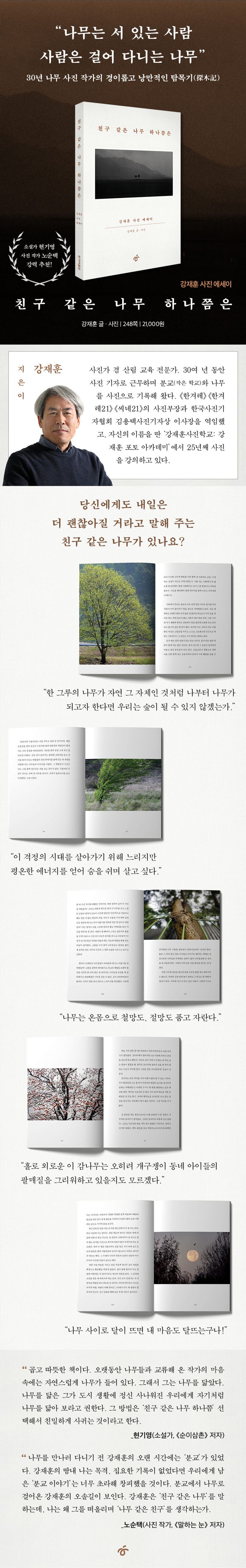 <친구 같은 나무 하나쯤은> 강재훈 작가가 30년 넘게 나무와 함께하며 얻은 깊은 통찰을 전해준다. 특히 글과 함께 실려 있는 사진은 문장의 생동감을 더하고 있다. 주변을 둘러보고 여유를 가지며 세상을 관찰할 수 있는 능력이 얼마나 소중하고 의미 있는지를 강조한다. 현실의 바쁜 일상에서는 그런 여유를 즐길 수 없지만, 이 책을 통해 나무와의 소통을 통해 얻을 수 있는 평온함에 대한 갈망은 특히 더욱 깊은 울림을 준다 .