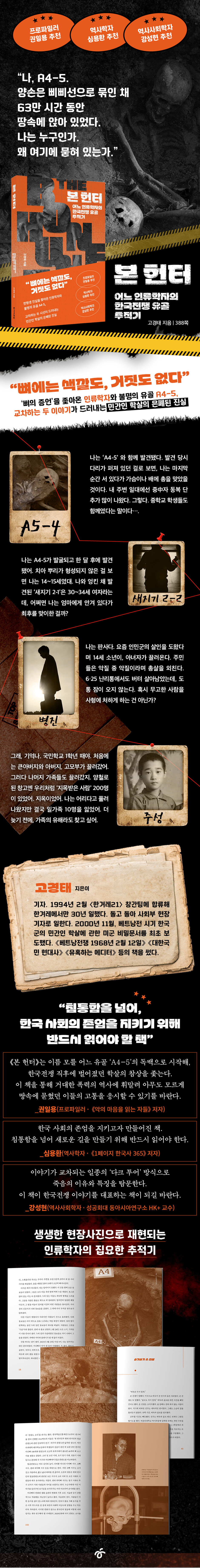 <본 헌터>는 충남 아산에서 발견된 정체불명의 유골들을 중심으로 전개되는 스펙터클한 유골 추적기이다. 이 책은 한국전쟁 당시 자행되었던 민간인 학살사건과 국가폭력 피해자의 상처를 심도 있게 다루며 민간인 학살의 참상과 땅속에 묻힌 진실을 집요하게 추적하는 과정을 담고 있다. 역사의 희미한 골목에서 발굴된 미지의 이야기는 어떤 모습을 하고 있을까. 고경태 작가의 한국 전쟁 유골 추적기는 지금 바로 시작된다.