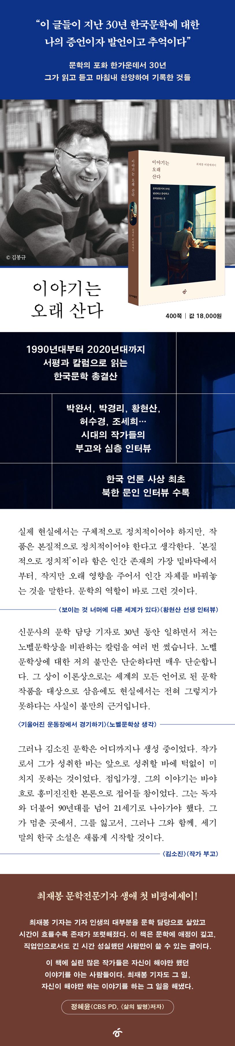 최재봉 작가의 <이야기는 오래 산다>는 그가 30년 동안 쌓아온 한국문학에 대한 풍부한 경험과 통찰력을 집대성한 비에세이이다. 한국문학의 다채로운 표정을 그려내며 저자의 사회적 역할과 문학에 대한 열정을 엿볼 수 있다. 이 책은 특히 한국 문학사를 가로지르는 30년의 흐름을 깊이 있게 다뤄 문학계의 주요 이슈와 작가, 그리고 작품들에 대한 통찰을 제시한다. 한국문학의 다양한 측면을 다루어 더욱 인상깊게 다가온다.