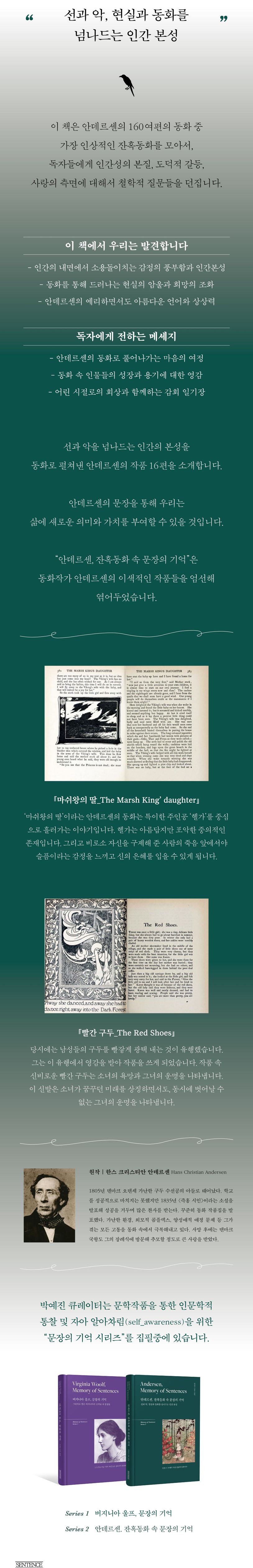 내 기억 속 안데르센의 동화는 행복한 기억을 가득 품고 있지만 실제로는 잔혹동화라 불릴 정도로 비통하고 서늘한 이야기에 가깝다. 단순히 어린이를 위한 이야기가 아니라 인간의 본성과 사회적 현실을 반영하고 있기 때문에 안데르센의 책은 더 큰 가치를 가지고 있다. <안데르센, 잔혹동화 속 문장의 기억>은 동화 속에 숨겨진 사회적, 심리적 메시지를 분석하여 사회적 현실, 그리고 시대에 따라 어떤 의미로 받아들여야 하는지에 대한 생각을 펼치는 책이다. 문학뿐만 아니라 심리학, 사회학적 관점에서도 풍부한 해석을 제공하며, 안데르센의 작품을 새로운 시각에서 바라보게 만든다.