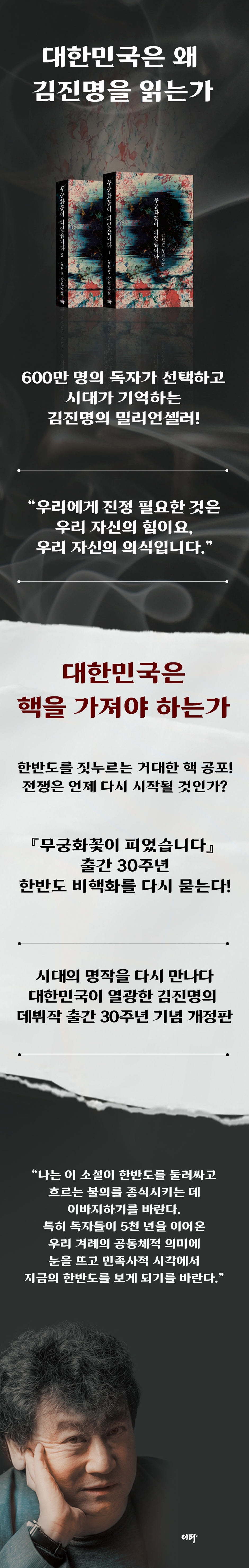 학창 시절에 김진명 작가님의 소설을 많이 접하고 싶었지만 짬이 나지 않아 미뤄뒀었다. 그렇게 시간이 지나 성인이 되었고 뉴스와 정치에 대해 관심도 많이 생겨서 적절한 비판의식을 가지며 볼 수 있었다. 내가 태어나기도 전에 발간된 책 <무궁화꽃이 피었습니다.>는 김진명 작가의 첫 소설이다. 30주년 기념 개정판이 나와 읽어보게 되었다. 이 책의 바탕이 되는 핵에 관한 주제는 박정희 정부의 핵무기 개발 계획에 관한 것이다. 실제 1970년 주한미군 철수 조짐에 1975년 초 한국의 핵무기 개발 계획이 추진되고 있었다는 사실이 밝혀졌고 그에 따른 여러 가지 말들이 있었지만, 밝혀진 바 없다. 그 이후에는 1979년 주한미군 철수 계획이 중단됨에 따라 핵무기 개발 계획도 중단되었다는 사실만 존재한다.