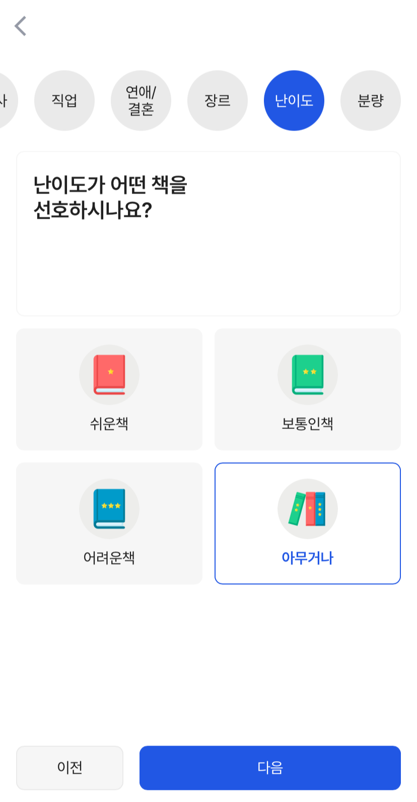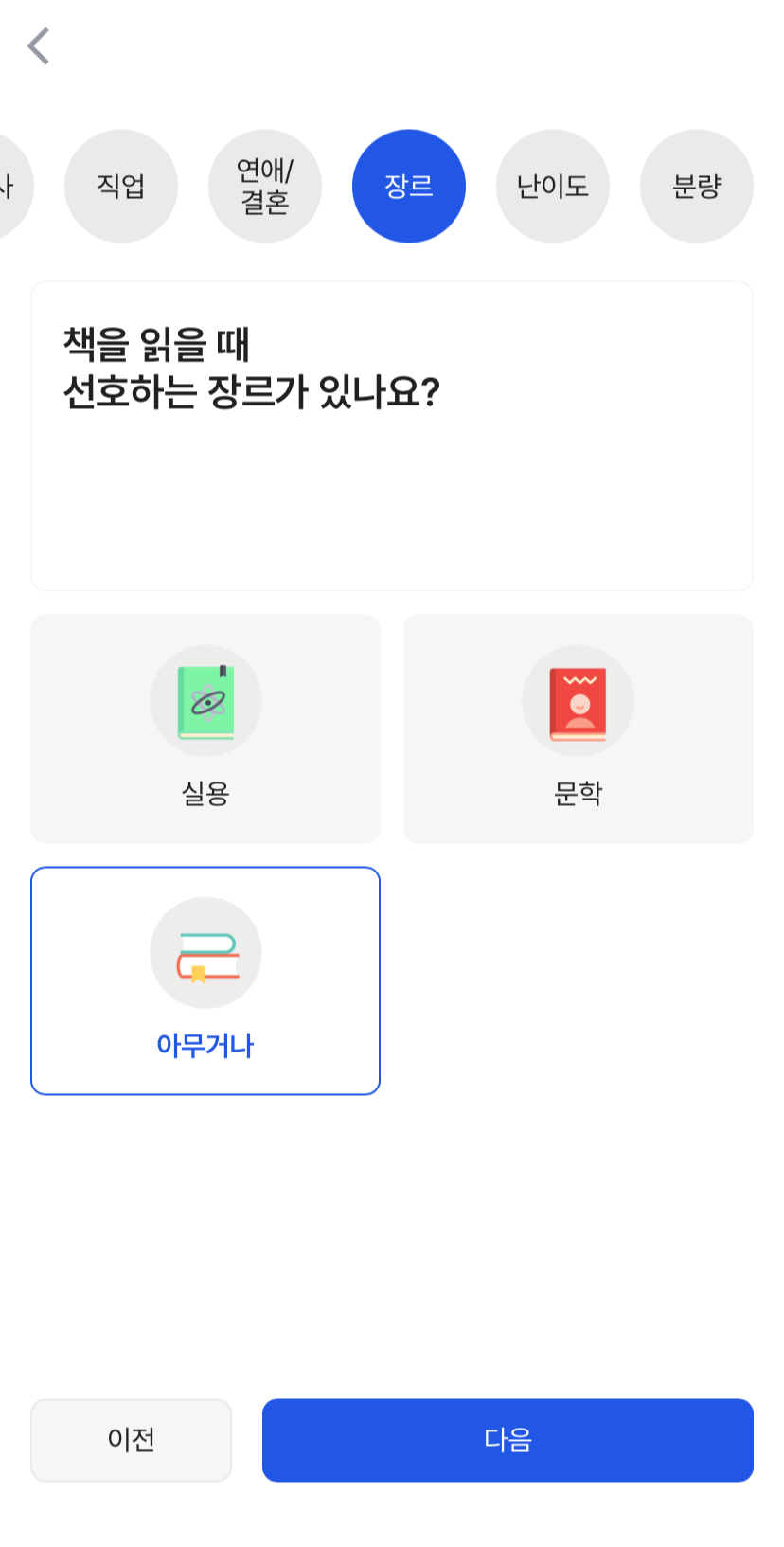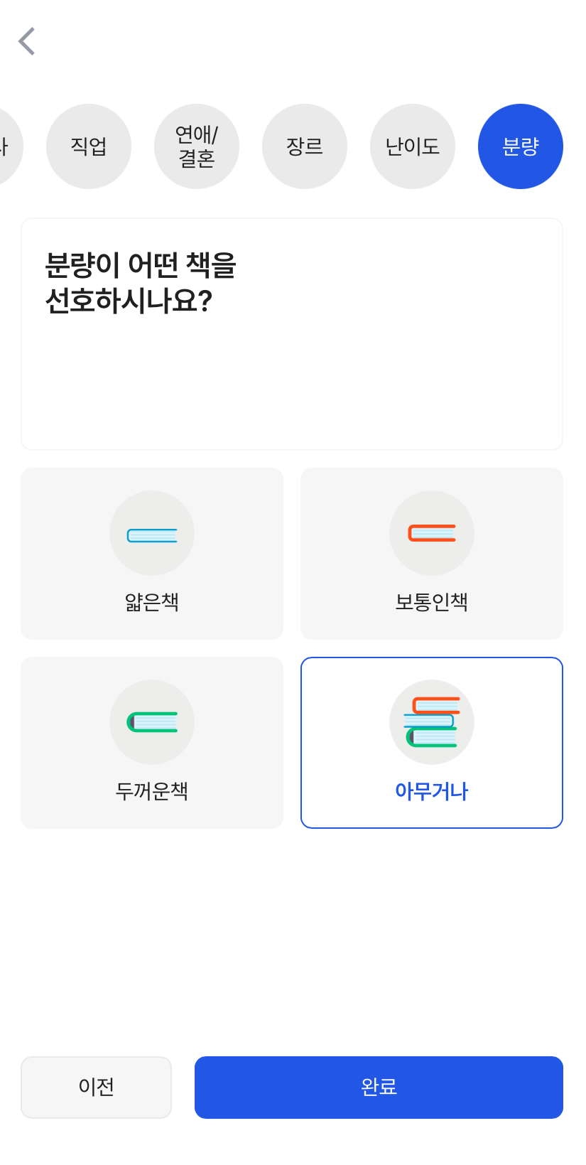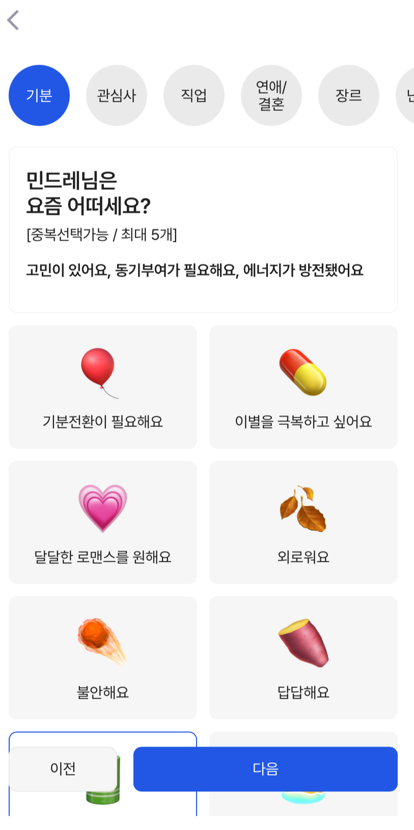 기분 / 관심사 / 직업 / 연애&결혼 / 장르 / 난이도 / 분량