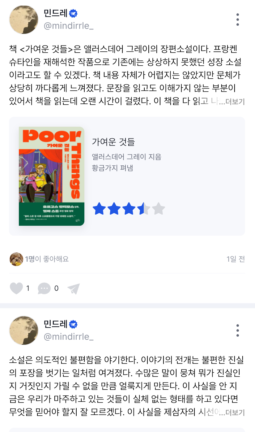 홈화면에 진입하게 되면 가장 첫 화면에 보이는 화면이죠. 바로 피드인데요. 지금은 저의 글만 보이지만 여러 사람들의 게시글이나 맞팔로우 하고 있는 사람들의 게시글이 뜹니다. 자신의 관심사 이외에도 다른 사람의 서평을 통해 책에 대해 관심을 가지게 될 수도 있으니까요. 여러 가지 글을 통해 책을 공유하고 의견을 나눌 수 있습니다.