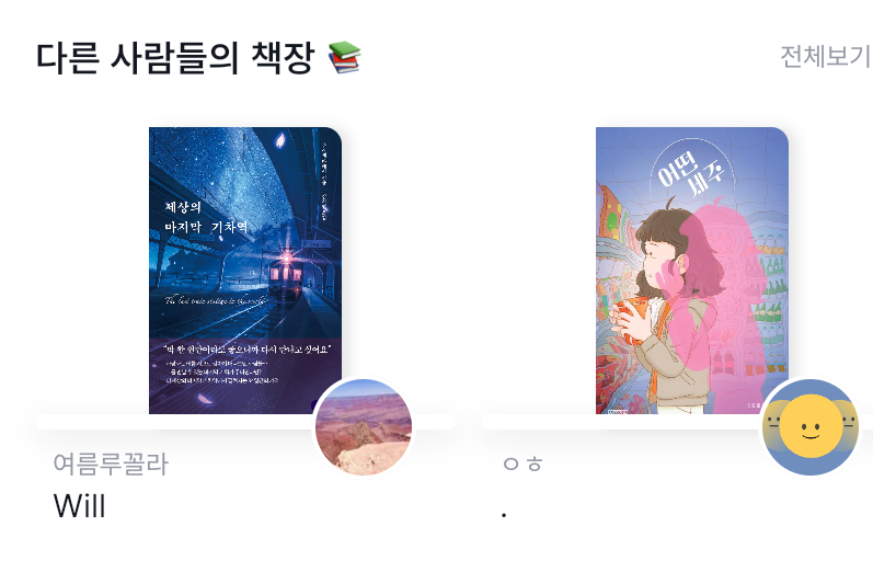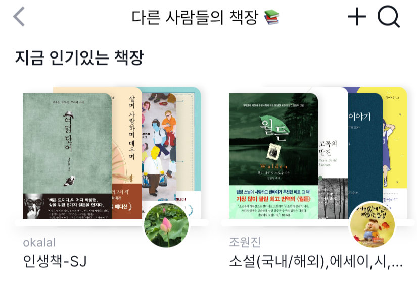 책을 발견할 수 있는 탭이에요. 책을 추천해 달라고 하는 글에 댓글을 달수도 있어요. 그뿐만인가요? 다른 사람들의 책장을 통해 책을 추천받을 수도 있답니다.