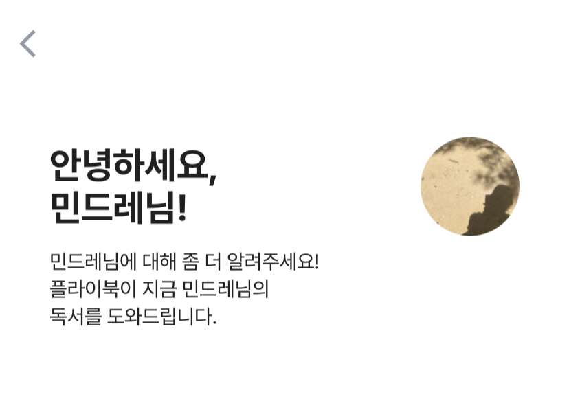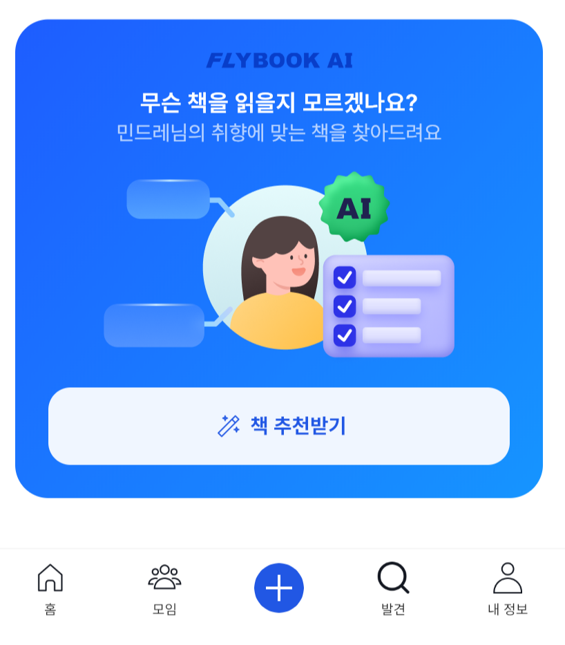 제가 가장 신기하고 또 도움이 되었던 기능 중 하나가 바로 플라이북 AI 기능입니다. 메인 화면에 들어간 뒤 발견 탭을 누르면 사용할 수 있는 기능인데요. 바로 취향에 맞는 책을 찾을 수 있습니다.