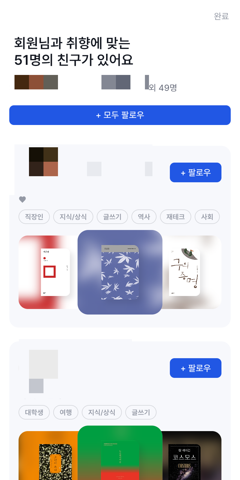 옆으로 넘길 수도 있고, '같은 책을 FLY 한 회원'이라는 문구가 뜨면 위로 스와이프 할 수도 있습니다. 저는 실제로 FLYBOOK 스토리를 구경하다가 한 회원의 FLYBOOK이 마음에 들어서 팔로우를 했고, 책의 내용에 대해서 이야기를 나눠보기도 했습니다. 책을 통해 사람들과 이어질 수 있다는 것이 신기한 경험이었고요. 취향이 같은 사람들을 앱으로 만날 수 있다는 것도 참 좋았습니다. 책을 읽을 시간이 없는 바쁜 현대인들에게 맞춤형으로 준비되어 있는 플라이북 앱을 얼른 만나보셨으면 좋겠어요.