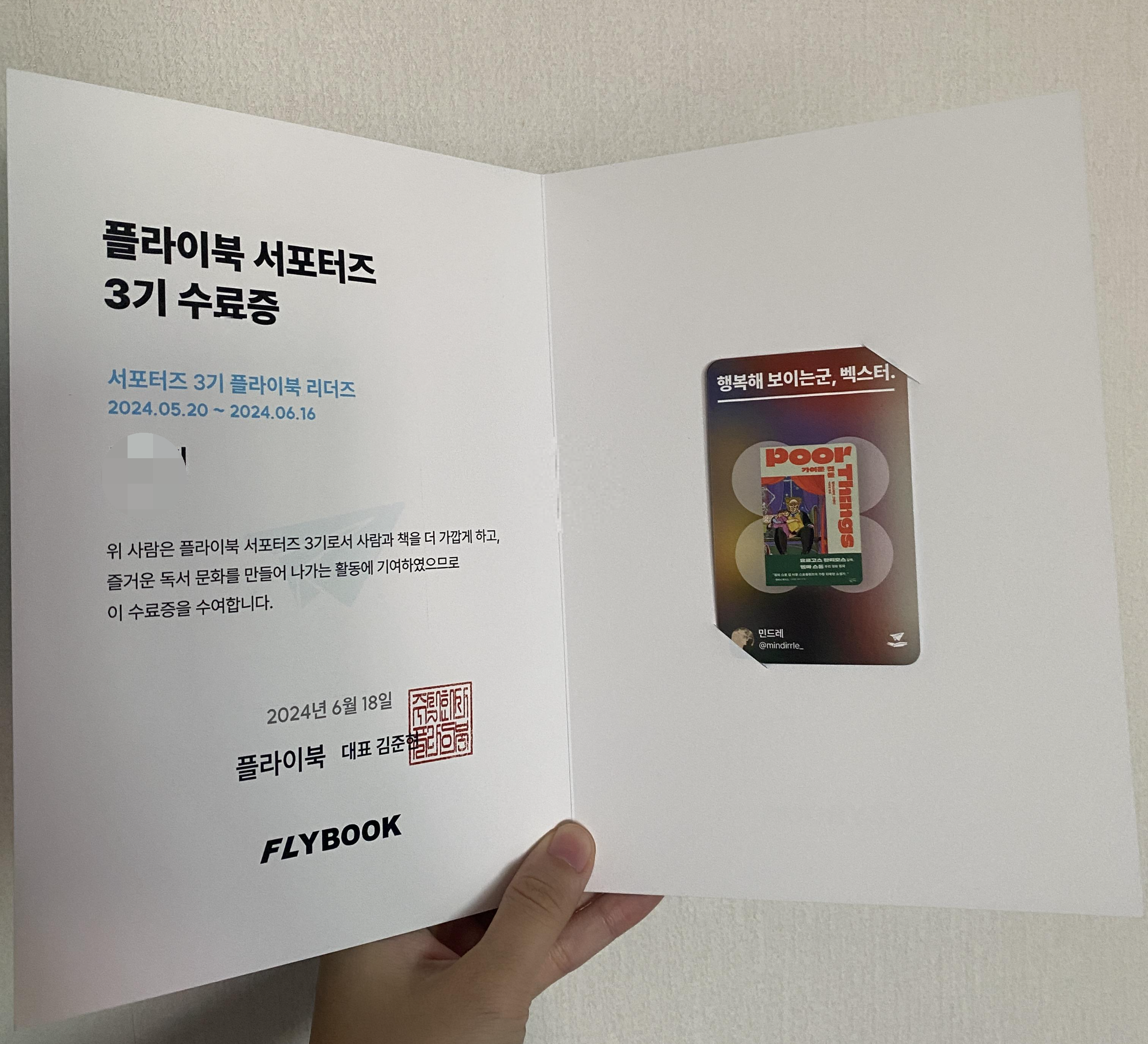 플라이북 리더즈 활동이 마무리 되었습니다. 많은 사람들과 책을 통해 이야기를 나누고 다양한 컨텐츠를 통해 활동할 수 있어서 좋은 시간이었습니다. 마무리와 동시에 수료증이 포함되어 있는 서포터즈 키트가 도착했습니다.