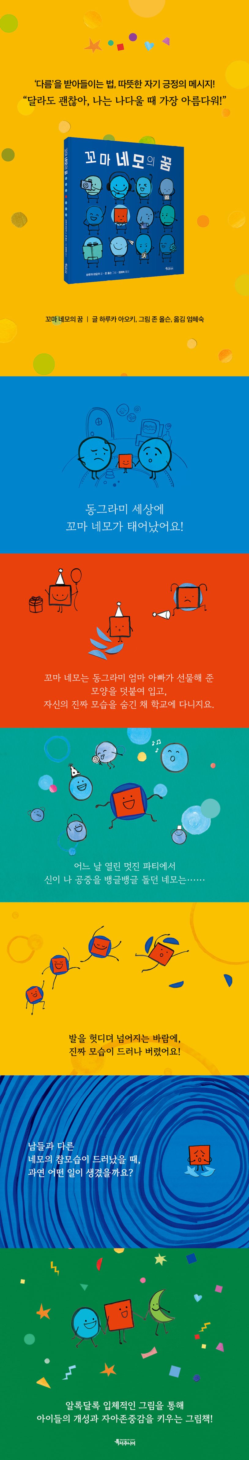 <꼬마 네모의 꿈>은 다름을 받아들이고 자기 긍정을 할 수 있게 돕는 그림책이다. 동그라미 세상에 꼬마 네모가 태어난다. 동그라미 세상과 다른 모습을 하는 네모의 모습에 엄마·아빠는 선물하고 네모는 그 모양을 덧붙여 입고 학교로 간다. 자신의 진짜 모습을 숨기고 친구들의 모습을 바라볼 때마다 자신과 남들이 다르다고 생각하게 된다. 그러던 어느 날, 파티에서 신이 나 뱅글뱅글 돌고 있던 꼬마 네모는 발을 헛디뎌 바닥에 넘어졌고, 입었던 모양이 벗겨지게 된 것이다.