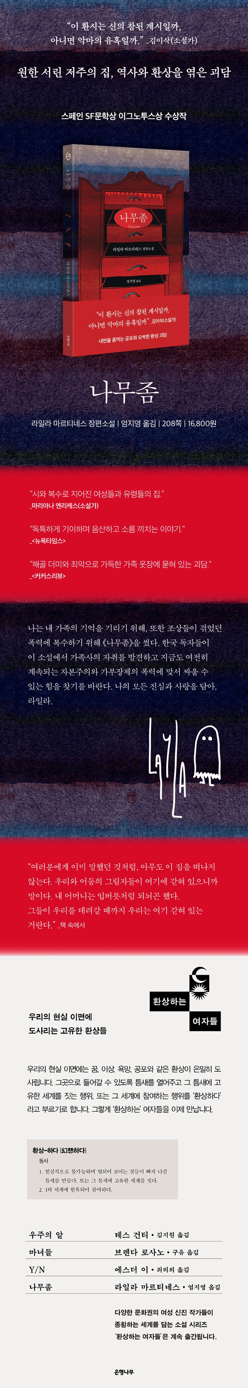 역사와 환상을 적절히 섞어 더욱 현실감을 더하는 <나무좀>은 라일라 마르티네스의 첫 소설이다. 이 작품은 스페인의 한 독립 출판사에서 출간된 이후 16쇄가 매진될 정도로 호평을 받으며 이그노스투스상을 수상했다. 세대를 거쳐 이어진 악순환을 끊기 위한 노력과 과거의 아픔을 극복하고 새로운 정체성을 찾아가는 과정을 생생하게 그려내고 있다. 이제 우리는 소외된 이들의 생생한 목소리를 통해, 섬뜩하면서도 강렬한 저항의 모습을 마주할 차례이다.