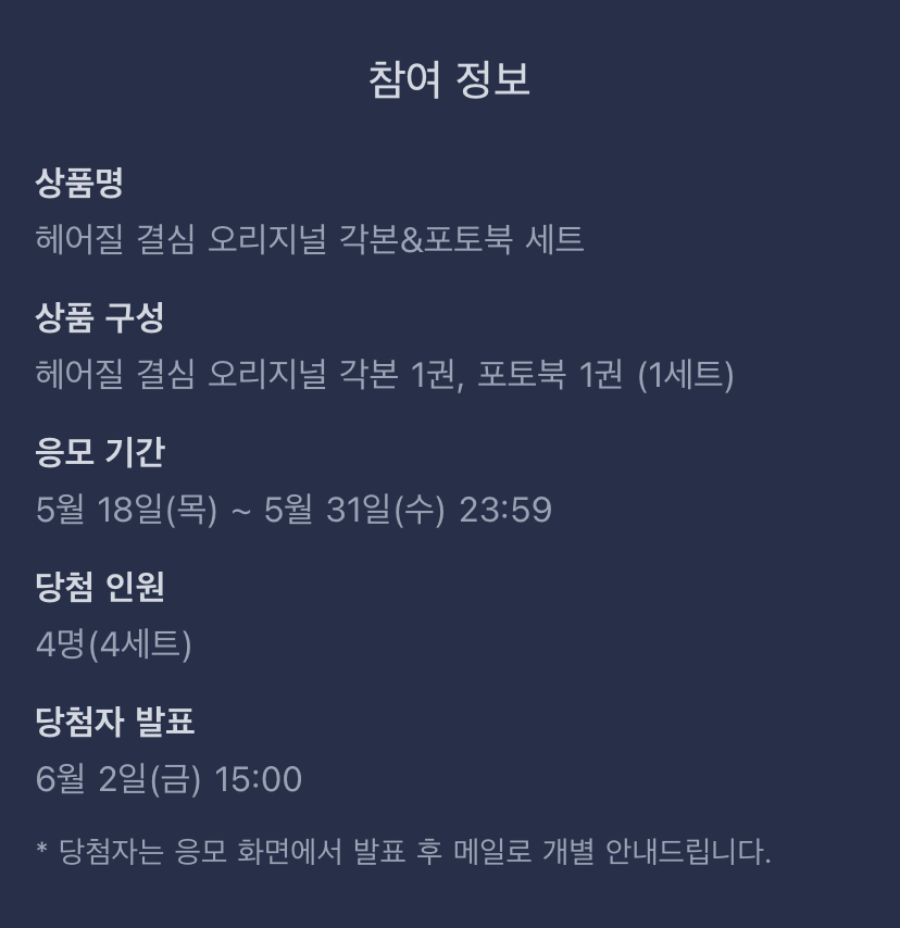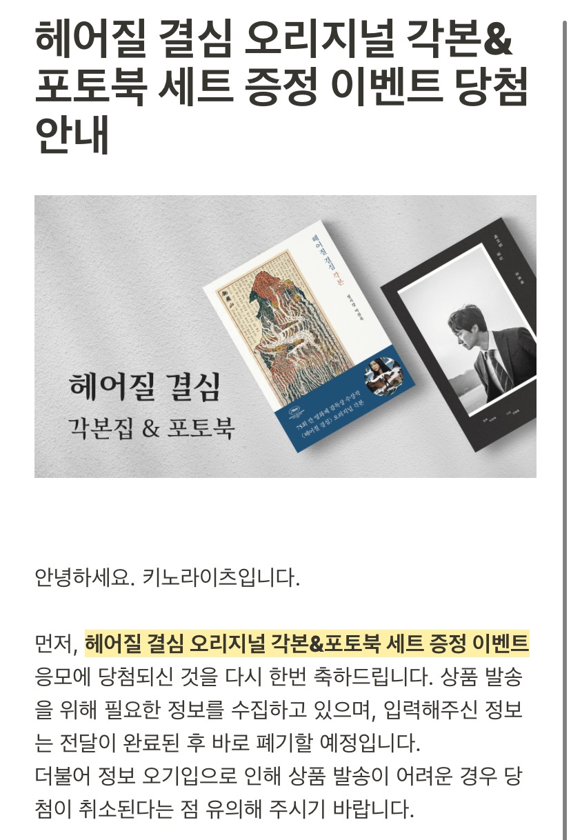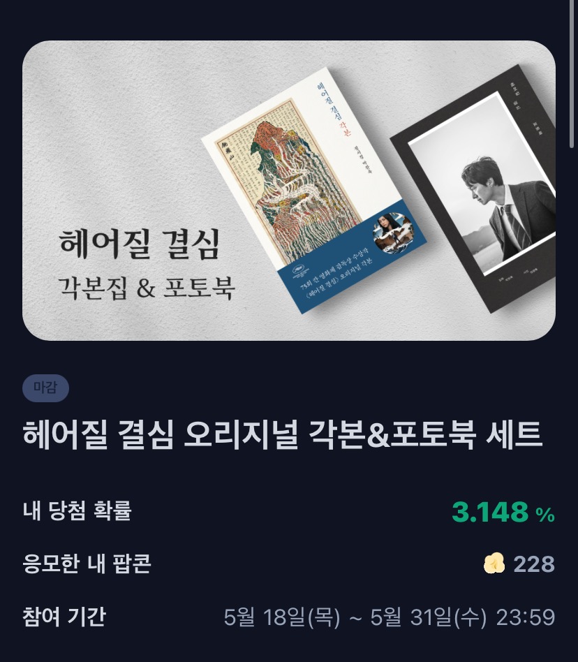 키노라이츠는 영화를 검색하는 기능뿐만 아니라 신호등 평가를 통해 여러 영화에 대한 정보를 파악할 수 있는 앱이다. 나는 초반부터 키노라이츠를 이용해서 요긴하게 쓰고 있었는데, 커뮤니티 기능과 이벤트를 비롯한 인증회원 제도가 생기면서 훨씬 활발한 활동을 하고 있었다. 그러던 중 헤어진 결심 각본집과 포토북 이벤트를 진행하는 게 아닌가. 너무 가지고 싶어서 가지고 있던 팝콘을 통해서 응모했다. (*팝콘은 출석체크와 여러 이벤트로 획득할 수 있고 이를 통해서 시사회, 예매권 등과 같은 이벤트에 응모할 수 있다.)