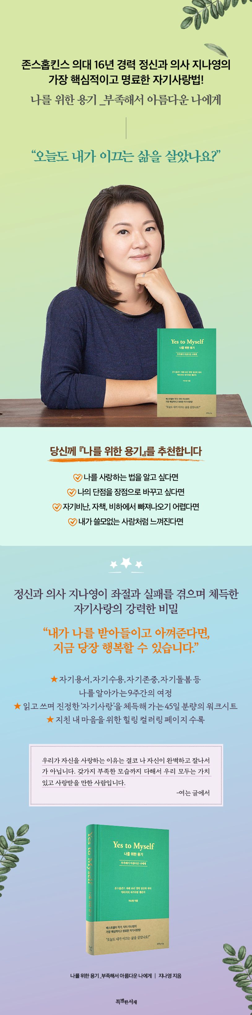 존스홉스킨 의대 16년 경력 정신과 의사 지나영이 <나를 위한 용기>를 출간했다. 우리 사회의 마음 건강 증진을 위해 ‘지사랑 챌린지’를 기반으로 ‘자기 사랑 실천 가이드’를 펼쳐냈다. 강의처럼 펼쳐지는 <나를 위한 용기>는 명료하면서도 묵직한 울림으로 다가온다. 우리의 삶을 잘 살아가는데 무엇보다 중요한 것이 바로 자신을 바라보는 건강한 시각이라고 말한다. “나 정도면 괜찮지”라는 단단한 믿음은 꼭 필요하다는 것이다. 자신뿐만 아니라 다른 사람들도 이 가이드를 따르며 큰 변화를 맞이했다고 한다. 지금까지 실천하지 못했던 이런 개념을 배우고 이해했다고 해서 바로 삶의 자세가 바뀌기는 어려울 것이다. 그래서 9주로 구성된 이 책을 꼼꼼히 읽고 하루하루 실천해 가며 워크시트를 연습하고 다음 장으로 넘어가기를 추천하며 명상을 통해 좀 더 나아진 자신을 마주해보자고 말한다.