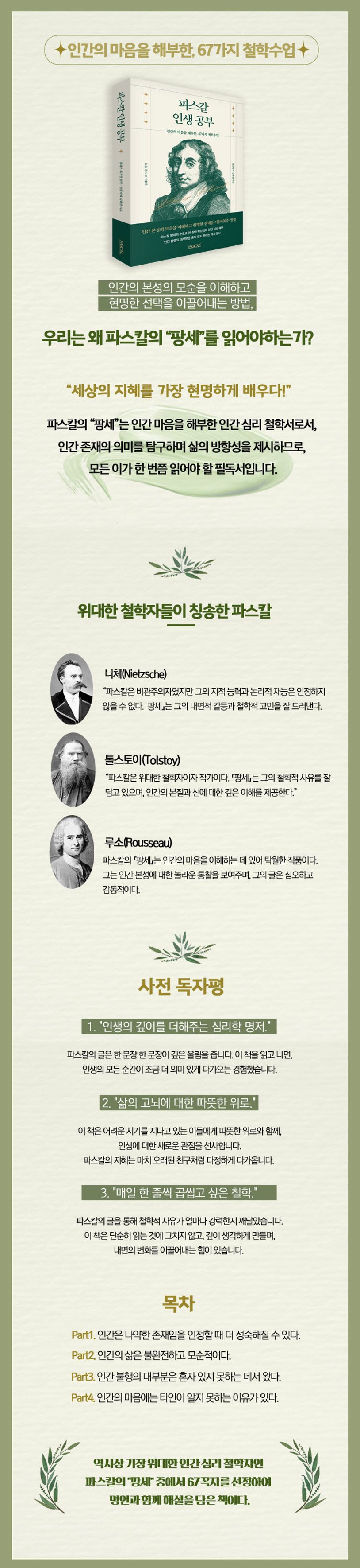 블레즈 파스칼의 <팡세>는 인간의 본질과 삶의 의미를 탐구하는 깊이 있는 철학적 작품이다. 인간 존재의 본질과 한계를 깊이 있게 탐구하여 독자가 자신의 존재와 삶의 목적을 성찰하게 해주며 자기 이해를 확장하는 데 큰 도움을 준다. <파스칼 인생 공부>는 팡세의 대표 구절 67개를 선택하여 불어 원문과 함께 인간의 심리를 해부할 수 있는 해설을 덧붙여 설명한 책이다. 이 책을 읽는 독자는 천재 인문학자 파스칼의 생각 및 인간 본성에 대한 통찰을 얻을 수 있다고 말한다.