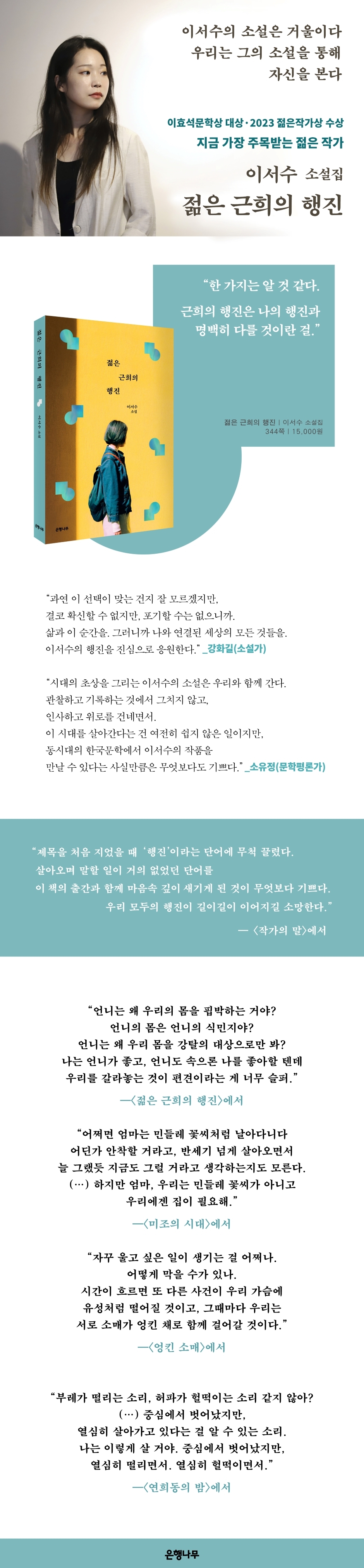 소설 <젊은 근희의 행진>은 이서수 작가의 첫 소설집이다. 시대의 초상을 드러내어 그 반짝이는 순간을 조명하여 등장인물의 삶이 실제 우리의 삶과 별반 다르지 않다는 것을 보여준다. 그럼에도 불안하고 자신이 하고 싶은 것을 하기 위해 앞으로 나아가는 이들의 모습에 함께 행진하고 싶어진다. 거울과 같은 책은 꿋꿋한 마음으로 행진하길 바라는 마음이 가득 담겨있었다. 제14회 젊은작가상을 수상한 단편소설 〈젊은 근희의 행진〉이 수록되어 있어 책에 대한 기대감을 높인다.