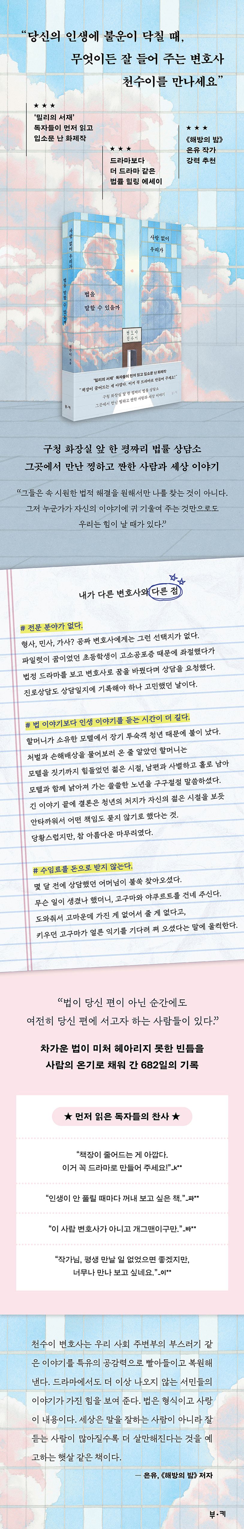 가제본과 함께 도착한 작가님의 편지가 굉장히 마음에 와닿았다. 어떤 위로의 말들도 도움이 되지 않을 때, 누군가의 이야기를 가만히 들어주던 시절이 떠올랐다고 하며 가만히 누군가 자신의 이야기에 귀 기울여 주기를 바라는 마음으로, 누군가에게 귀 기울이던 그 순간을 써내려 갔다고 말했다. 의뢰인들의 사연을 듣다 보면 때로는 같고 때로는 다른 그 이야기 안에는 항상 누군가에 대한 사랑이 있었다는 것이다. 이 이야기는 그렇게 법을 말하기 이전에 사랑이 있었다는 사실을 기억하길 바라는 마음에서 시작됐다고 말했다. 사랑 없이 법을 말할 수 없고, 사랑없이 사람을 말할 수 없다는 평범하지만 조금은 특별한 이야기에 귀를 기울여 달라고 한다. 언젠가 당신에게도 누군가가 필요할 때, 그 사람 역시 당신의 이야기에 귀 기울여 줄 것이라고 믿는다는 그 말이 이 책에 더욱 스며들게 만들었다.