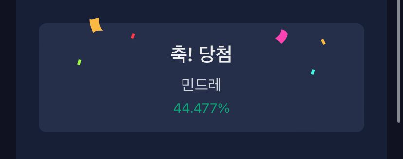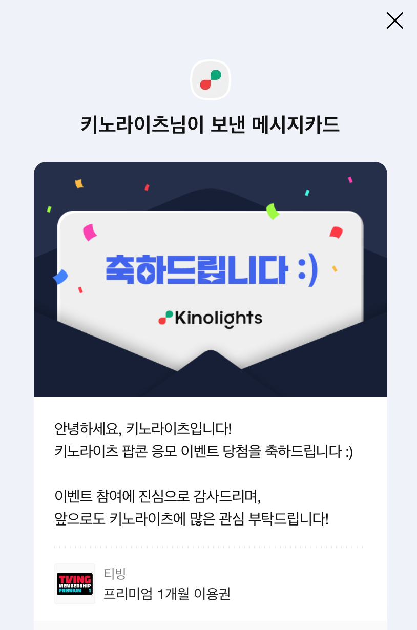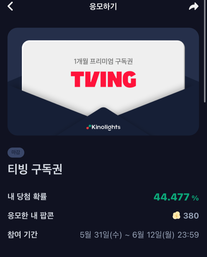 저번에 소개했던 키노라이츠라는 앱은 영화를 검색하는 기능뿐만 아니라 신호등 평가를 통해 여러 영화에 대한 정보를 파악할 수 있다. 출석체크를 통해 팝콘을 얻고 팝콘을 통해서 자신이 원하는 혜택을 응모할 수 있다. 몇달 전의 티빙 이용권 할인 혜택 기간이 애매해서 하지 않고 있었는데, 사용하고 있던 이용권이 곧 만료가 되어 결제를 할까말까 고민하고 있었던 찰나에 키노라이츠 응모하기 이벤트가 눈에 들어왔다. 이번에 내가 응모한 것은 바로 티빙 1개월 프리미엄 구독권이다. 30당첨 인원은 30명이고 나의 확률 44프로라 당첨되었으면 좋겠다는 생각으로 기다리고 있던 중 당첨 소식이 들려왔다.