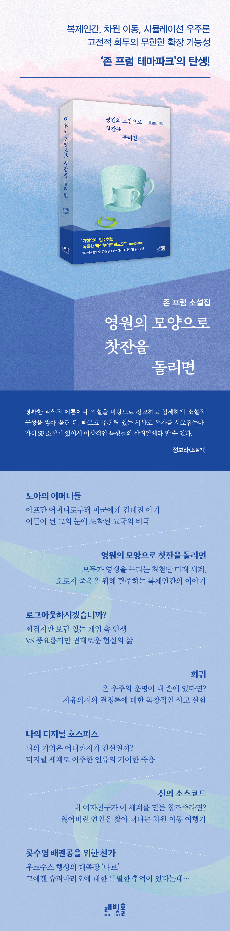 실체 없는 두려움은 끊임없이 경계하면서도 자연스러운 과정 중 하나로 여겨진다. 기술은 계속해서 발전할 것이고 인간을 앞지를지 아닐지도 아직 확정되지 않았다. 어떻게 될지 모를 미래에 대한 두려움은 그렇게 시작된다. 혹시 모를 가능성은 sf라는 장르 앞에서는 그 모습을 공고히 다져가는 데 크게 기여한다. 7개의 단편으로 구성된 이 책은 과학기술에 대한 이야기를 풀어내고 있으며 그 세계를 마주하는 사람들의 모습을 보여준다. 저마다의 선택이 미칠 영향은 누구도 알 수 없지만 일생의 지대한 영향을 미치리라는 것은 자명했다.