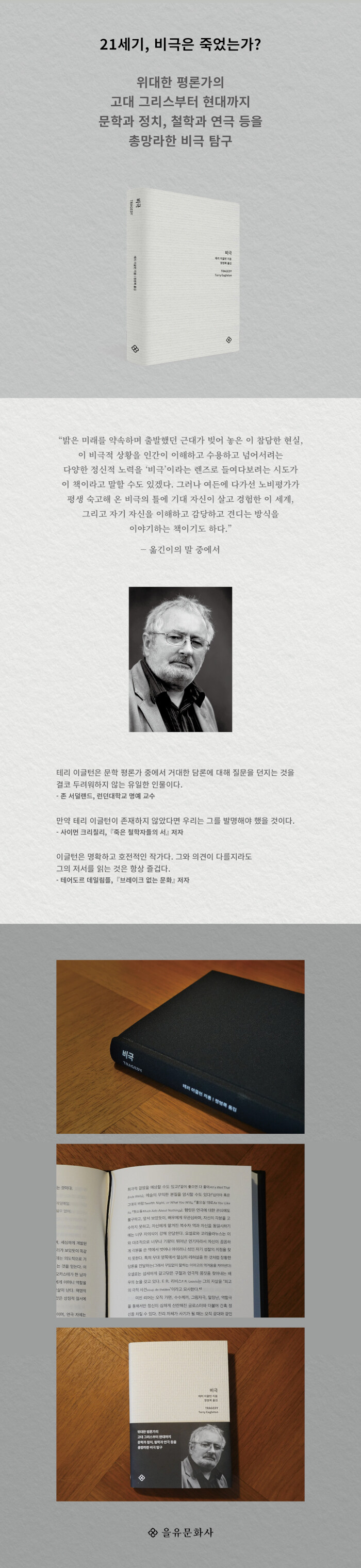 비극의 구체적 의미는 슬픔, 불행, 비참함을 소재로 한 극의 갈래이다. 비극적인 정신은 숭고함이 드러날 수 있으며 비극은 그 자체만으로도 주인공의 화려한 특별함에 고귀함을 더한다. 이러한 요소가 모여 그 형체를 이루고 있다. 그렇다고 해서 허무주의에 부딪히면 모든 것이 무의미해진다. 비극적 예술은 고통이 존재하는 것은 아니다. 비극은 침묵의 이면에서 울컥하고 밀려 나와 저마다의 무언가를 이야기한다. 지식인이자 평론가인 테리 이글턴의 책 <비극>은 비극의 시작과 발전 과정을 통해 해당 장르에 대한 새로운 설명을 해낸다.