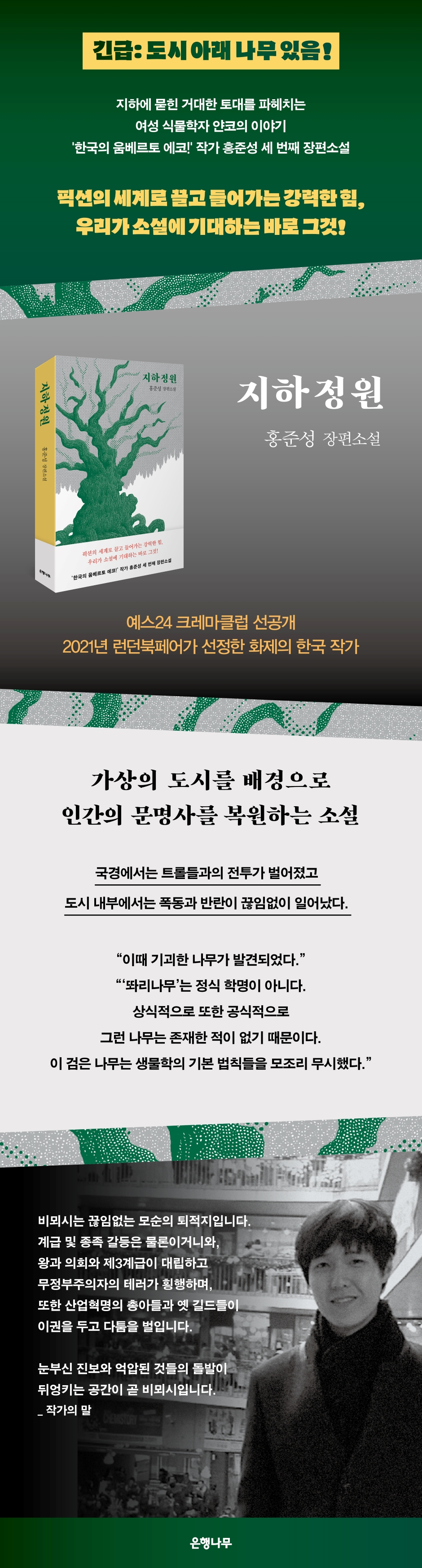 책 <지하정원>은 홍준성의 장편 소설이다. '비뫼'라는 가상의 도시를 배경으로 하고 있는 묵직하고 빼곡한 세계관은 극도의 몰입감을 자랑한다. 분명 한국 소설이지만 굉장히 넓은 세계관을 통해 접근하는 허무의 대서사시는 상당히 인상깊다. 소설의 배경이지만 인간 문명사에서 한번쯤은 등장했던 도시처럼 느껴진다. 우리가 살아온 사회에와 인간에 대한 본질을 탐구하는 순간을 마주한다. 그 뿐만 아니라 철학적 성찰까지 고려하는 소설의 결은 오랜 시간 동안 남을 것 같다.