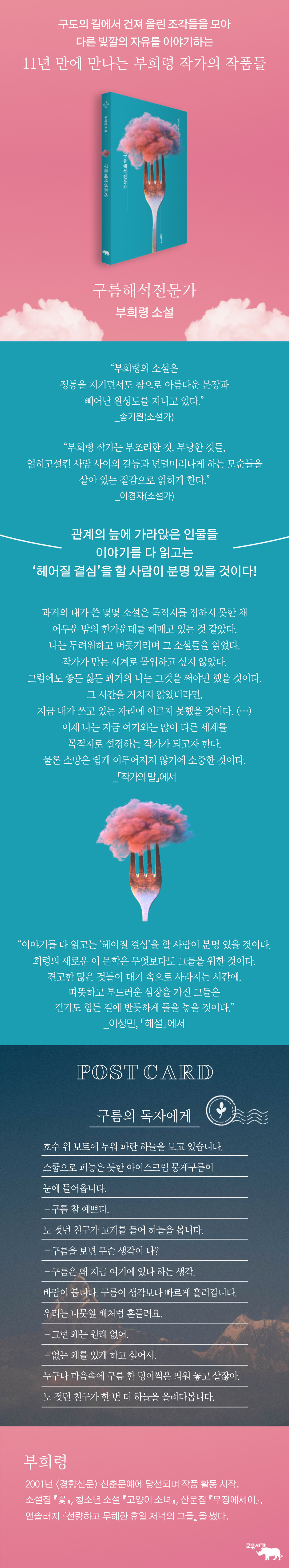 제목과 표지부터 기대감을 불러일으킨다. 그래서 책을 보기 전부터 상당히 기대하고 보게 되었다. 이름만큼이나 상당히 흥미로워서 단숨에 읽었던 부희령 작가의 소설<구름 해석 전문가>은 6개의 단편 소설로 구성되어 있다. <콘도르는 날아가고> <구름 해석 전문가>, <만주>, <귀가>, <내 가슴은 돌처럼 차갑고 단단하다>이다. 구름에 가려진 이야기들은 작품마다 독특하게 스며들어 있는 단어들의 나열과 조합으로 구성되어 있어 더욱 큰 몰입감을 선사한다. 구름이라는 이름은 있지만 자유로운 형체로 구성되었다 사라지고 마는 구름을 해석하는 것이 가능할지도 모르겠다.