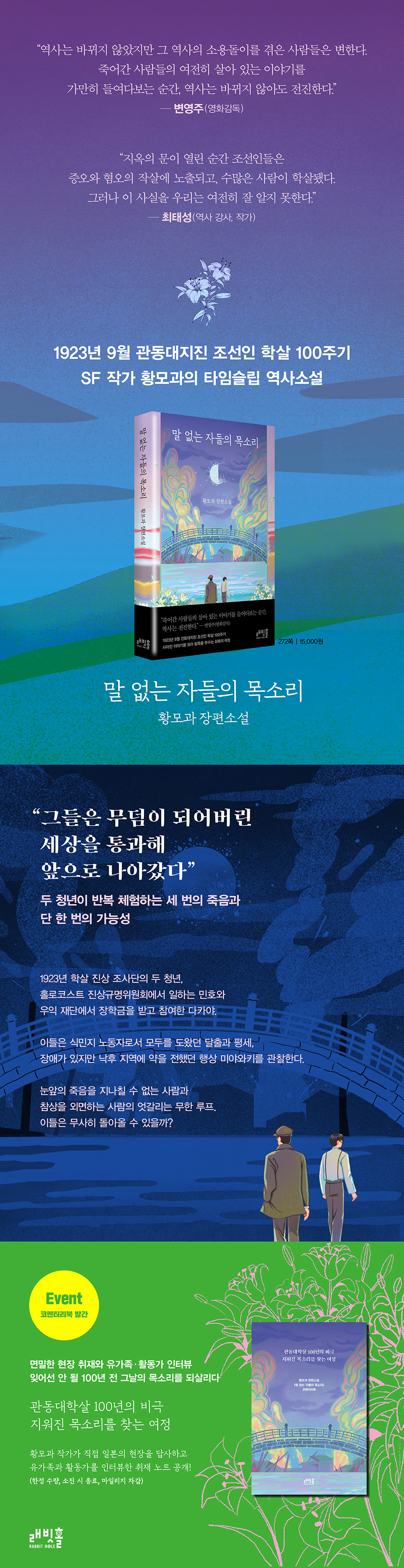 SF 소설가 황모과 작가가 관동대학살 사건을 모티브로 한 타임슬립 역사소설 <말없는 자들의 목소리>이 광복절을 맞아 출간한다. 2023년은 관동대지진 조선인 학살 100주기가 되는 해이기 때문에 더욱 의미 있는 소설이다. 시간에 따라 점점 잊혀가는 사건에 대한 재조명은 묵직한 어조로 진행되며 잊혔던 희생자들의 목소리를 되살리는 노력을 기울인다. 100년이 지났지만 그렇게 많이 달라지지 않은 현재의 모습을 역설하듯 책은 그 아픔을 딛고 나아가는 시도를 한다. 잘 알려지지 않는 사건인만큼 사건을 재구성하는 노력을 통해 우리가 지금 무엇을 해야 하는지 생각해 보게 된다. 우리가 은연중에 잊고 있었던 과거의 이야기는 이렇게도 생생한 모습을 하고 있었다.
