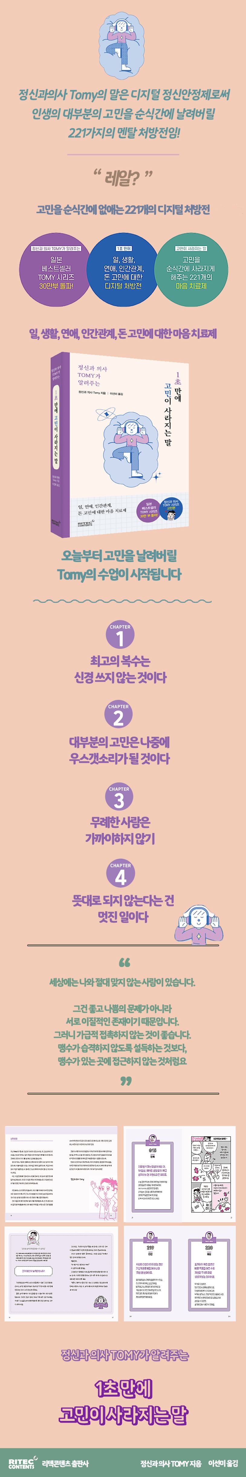 정신과 의사인 Tomy는 수많은 환자를 진찰하며 고민을 완화시키는데 효과적인 단어를 메모하여 정리하였다고 한다. 자신에게도 큰 힘이 되어주었던 말들은 어떤 모습을 하고 있을까? 책 '정신과 의사 Tomy가 알려주는 1초 만에 고민이 사라지는 말'은 처방전처럼 필요할 때마다 꺼내 보면 좋을 말들로 가득하다. 지금이 아니어도 언젠가 와 닿을 말들을 실어 둬 생각은 하되 잘 생각할 수 있는 방법을 제시한다. 보다 더 나은 정신건강을 위한 처방전을 건네어준다. 결코 짧지 않은 단어들이 나의 마음을 두드린다.